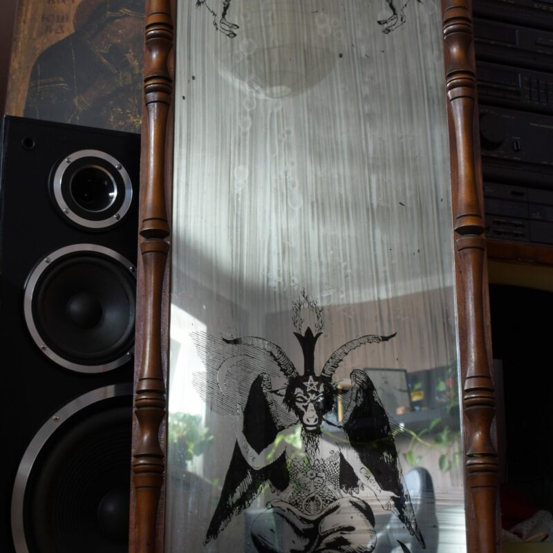 Lustro designerskie w antycznej ramie, zdobione ręcznym grawerem pękniętego miecza.