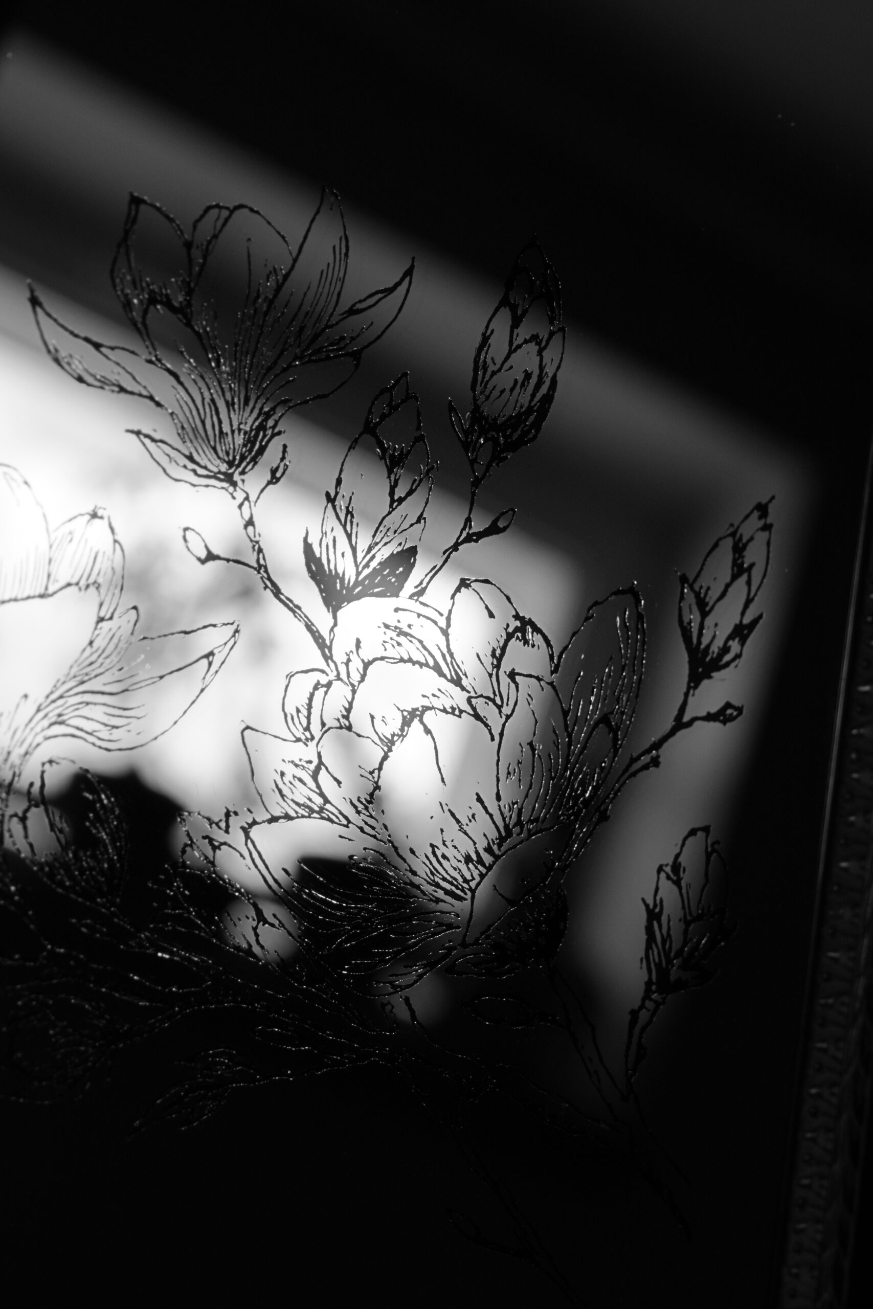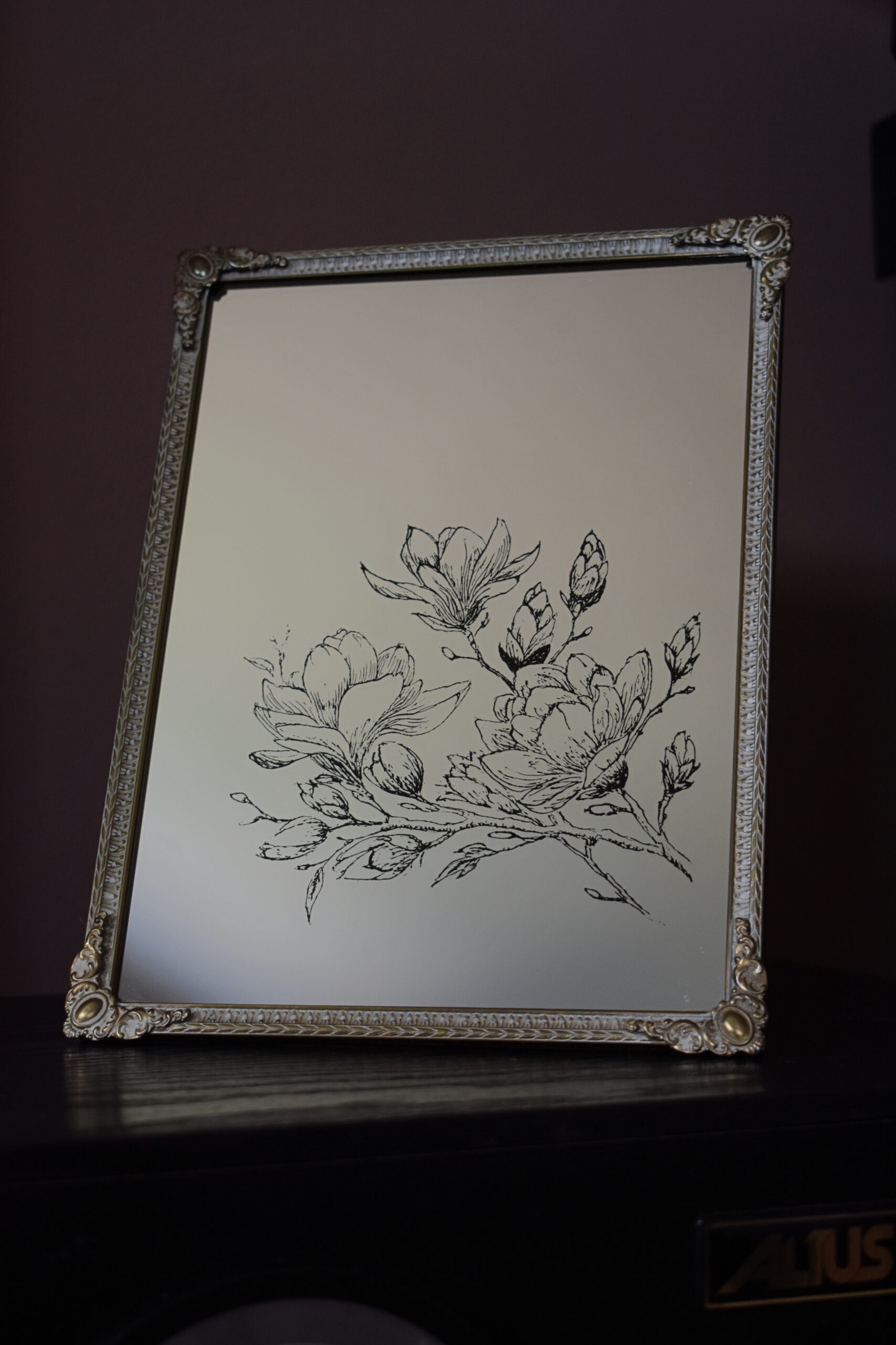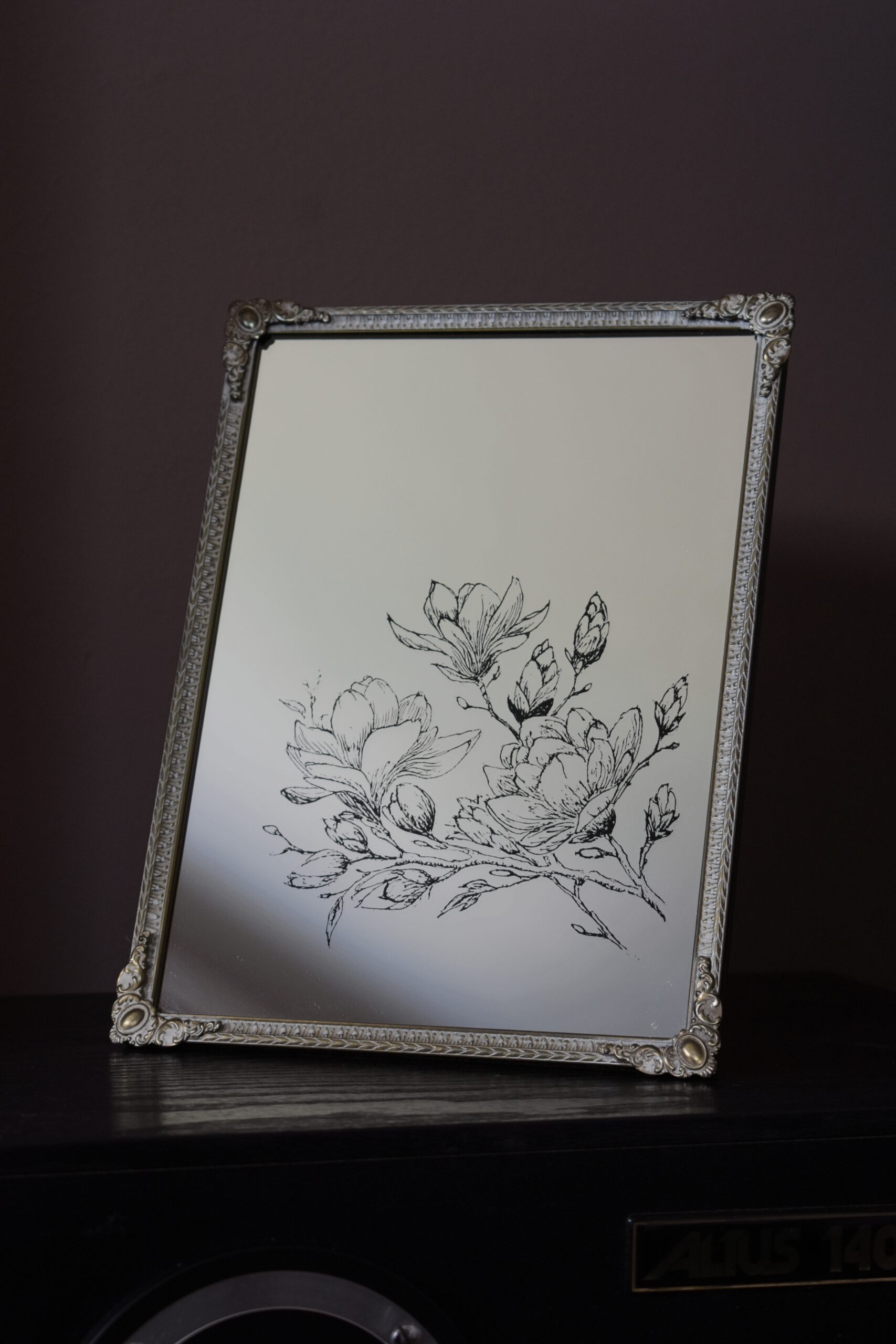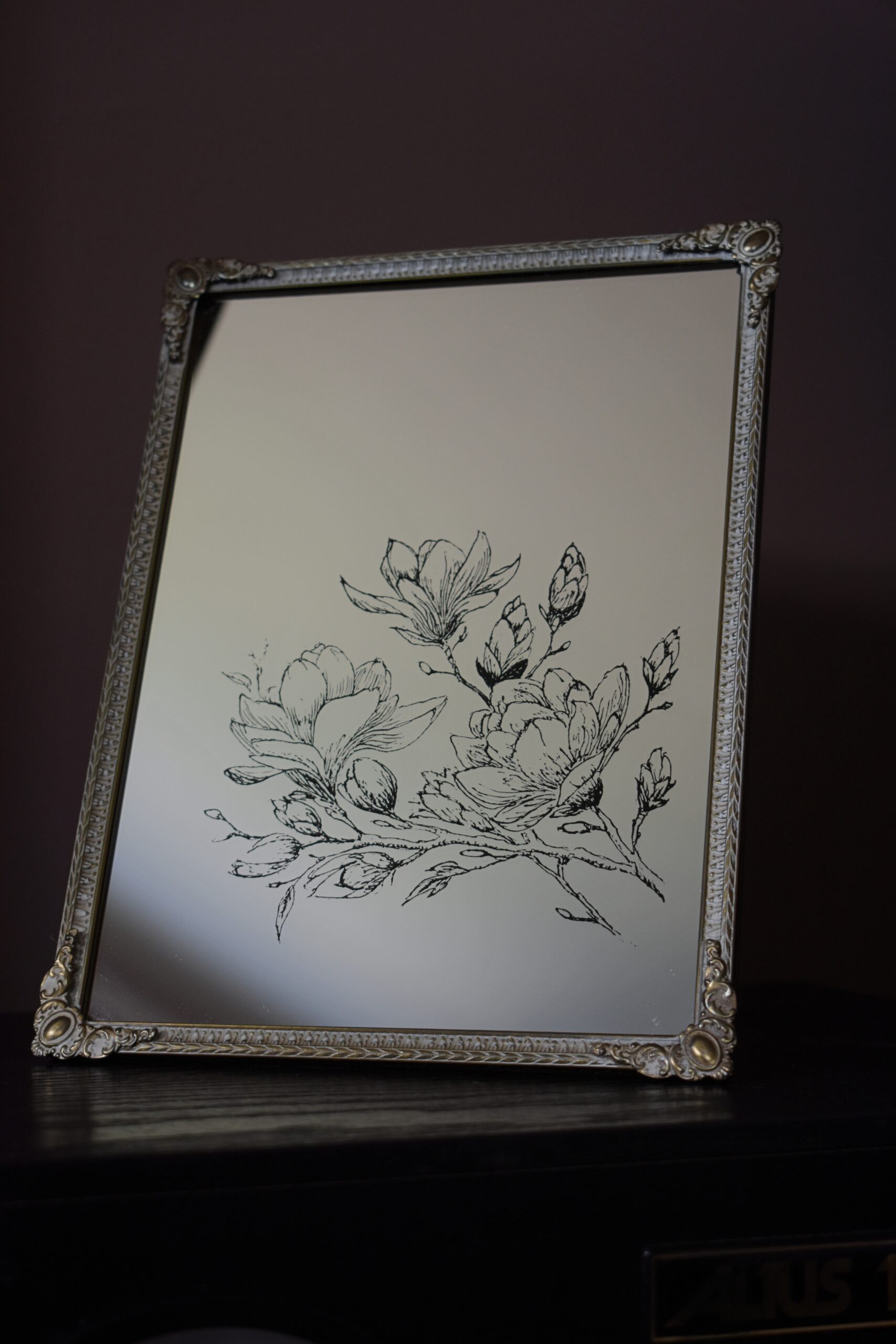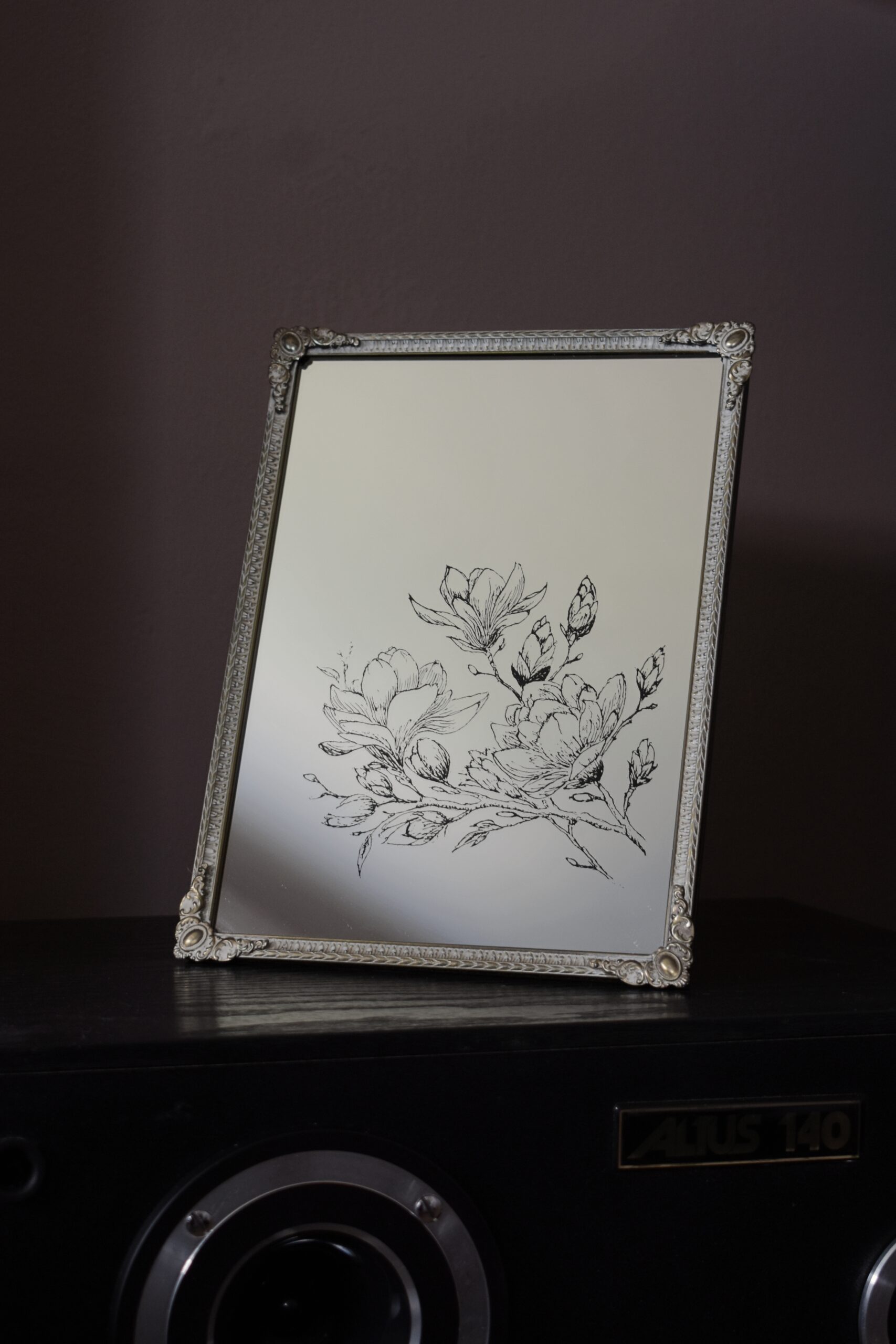 lustro z grawerem, lustro z magnolią, botaniczne lustro, romantyczne lustro, artystyczne lustro, lustro z kwiatami, dekoracyjne lustro, lustro vintage, lustro z odzysku, delikatny grawer