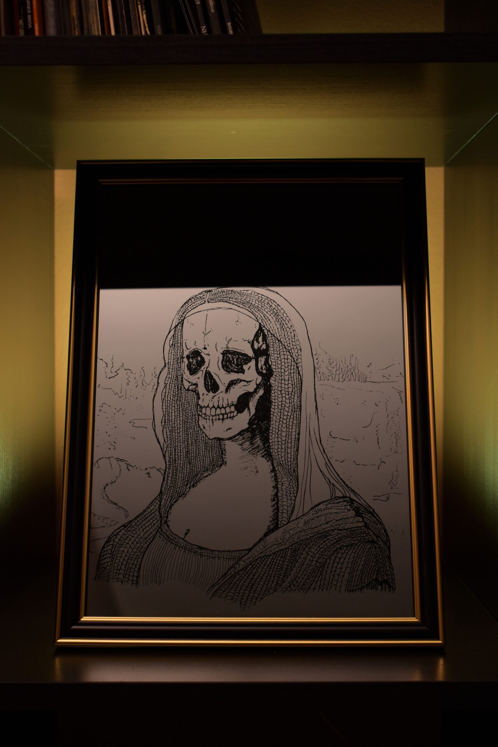 Lustro oprawione w czarną ramę ze złotym akcentem, zdobi ręcznie wykonany grawer inspirowany „Mona Lisą” Leonarda da Vinci, w którym zamiast tajemniczego uśmiechu i delikatnej twarzy pojawia się wyrazista czaszka.