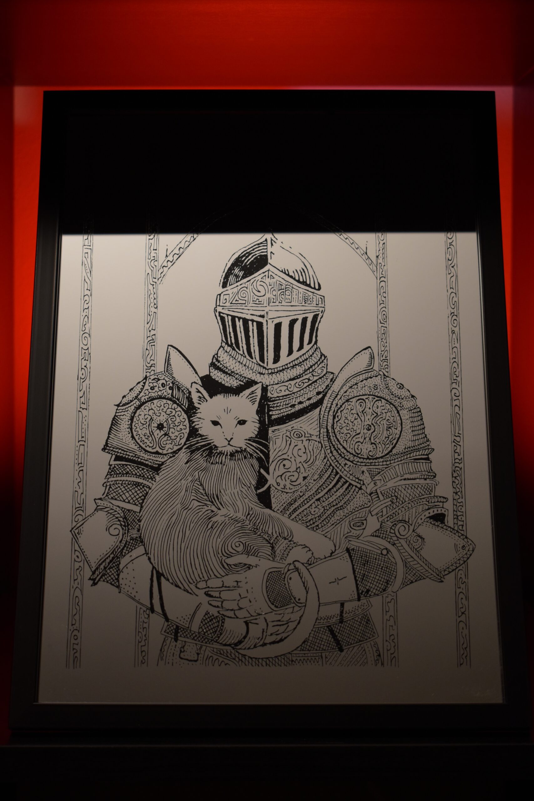 Zbroja ozdobiona jest misternymi ornamentami, a kot, siedzący dumnie w ramionach wojownika, wprowadza do kompozycji nutę ciepła i lekkości.